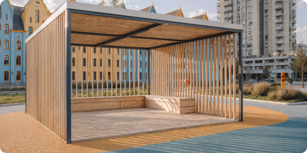 Навесы «Город» — это яркий дизайн, любимый детьми. Красочные фасады с рисунками животных и цветов превращают обычную площадку в игровое пространство. Такие модели особенно востребованы на юге России, где дети проводят много времени на улице.