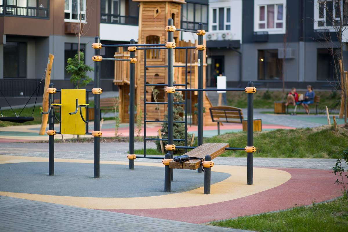 - Функциональность. Игровые комплексы рассчитаны на разные возрастные группы, есть отдельные зоны для малышей и старших детей, спортивные тренажёры и воркаут.