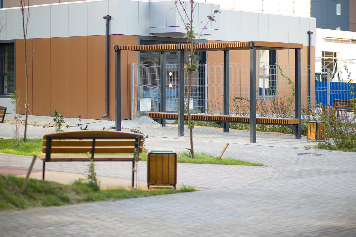 - Комфорт для жителей. Перголы создают тень, скамейки и качели обеспечивают места для отдыха, а урны и навесы поддерживают чистоту во дворе.