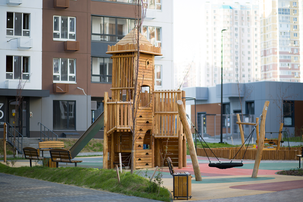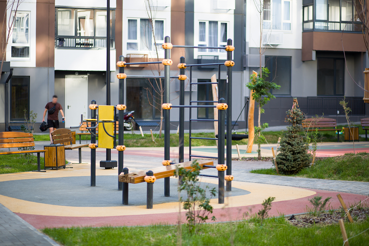 Теперь двор ЖК «Левенцовский» стал пространством, где есть всё необходимое: игровые комплексы, спортивные зоны, уютные места для отдыха. Для детей — безопасные и интересные площадки, для подростков — возможность заниматься спортом, для взрослых — удобные лавочки и качели-диван.