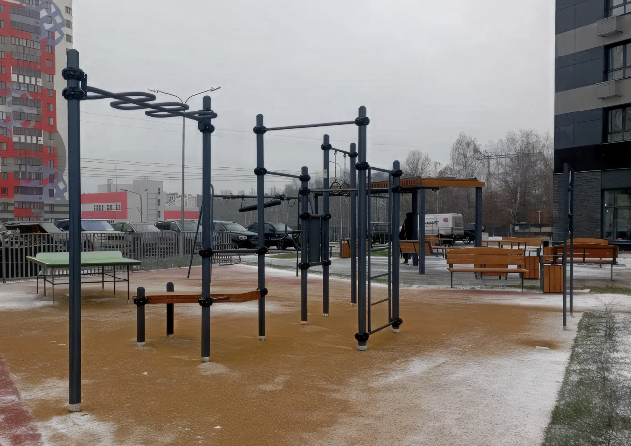 Стол интегрирован в общее пространство спортивного кластера и дополняет воркаут- и тренажёрную зону, расширяя сценарии активного досуга для жителей комплекса. Размещение выполнено с учётом нормативных зон безопасности и удобства подходов.
