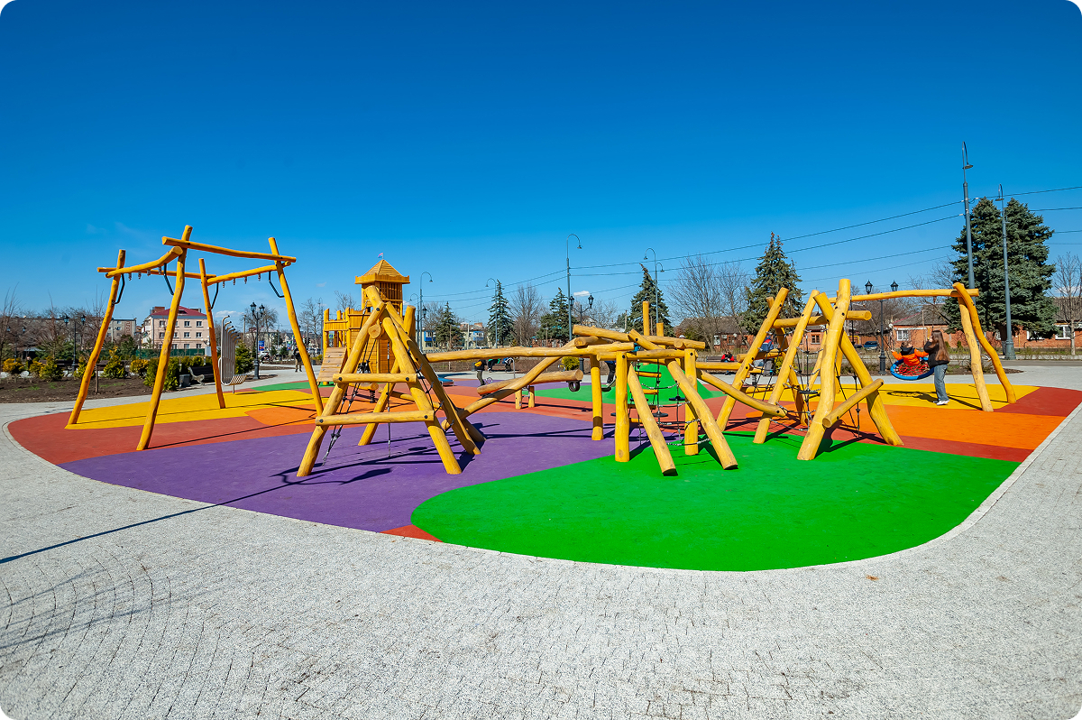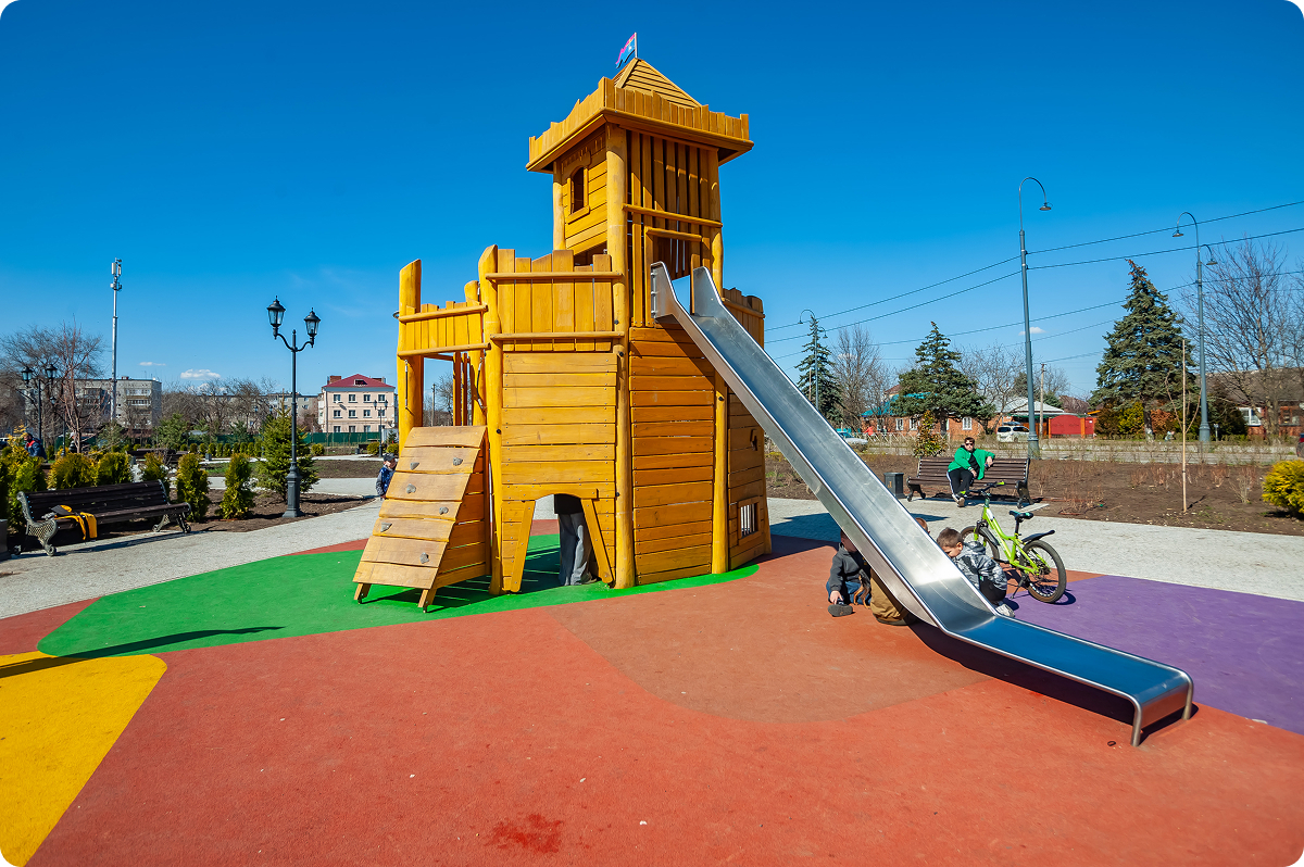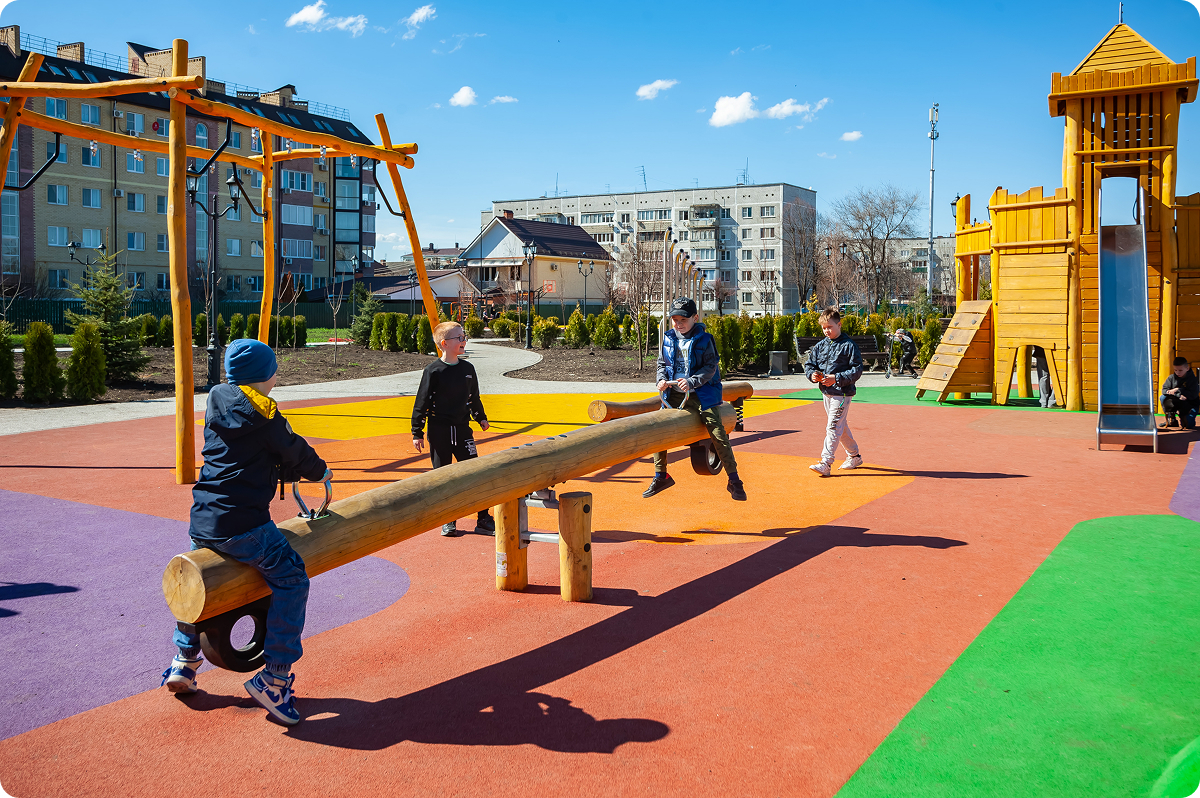 Основная задача заключалась в создании современной детской площадки, отвечающей требованиям безопасности, устойчивости и удобства эксплуатации. При этом важно было сохранить гармоничное сочетание с архитектурой города и жилой застройкой.